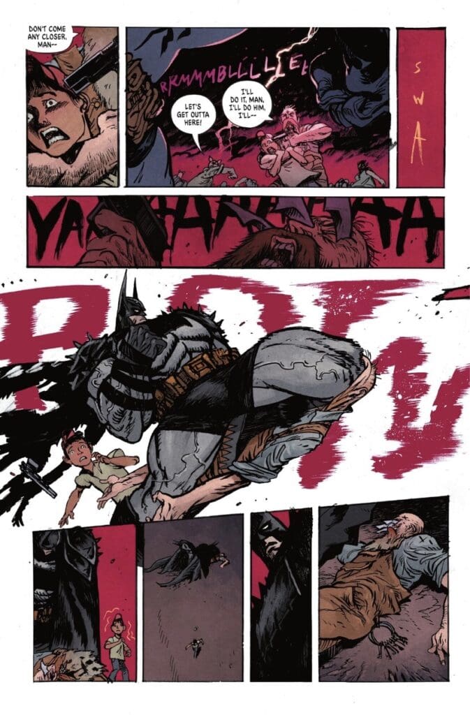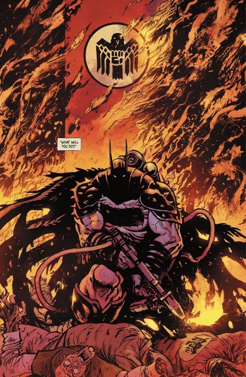 The action is unrelentingly brutal. When Batman faces off against these fanatics, it’s pure demolition: we’re talking powerbombs, boots to the face, and repeated hammer fists. It all has that glorious, hulking, precise energy that instantly reminds you of The Dark Knight Returns. Letterer Clayton Cowles sells every sickening blow, especially a bone-breaking KRAKK that leaves no doubt about a certain right hand being completely shattered.