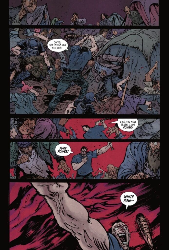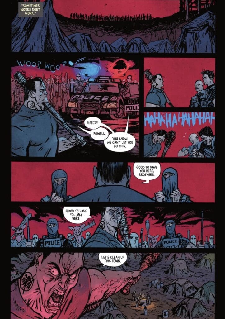 And the colors! Spicer enhances the intensity with a sickly lime green for the ominous Slaughter Swamp, which is brilliantly contrasted with the red and blue siren glare during the migrant camp raid, making the scene feel all the more intense and wrong.