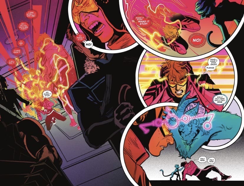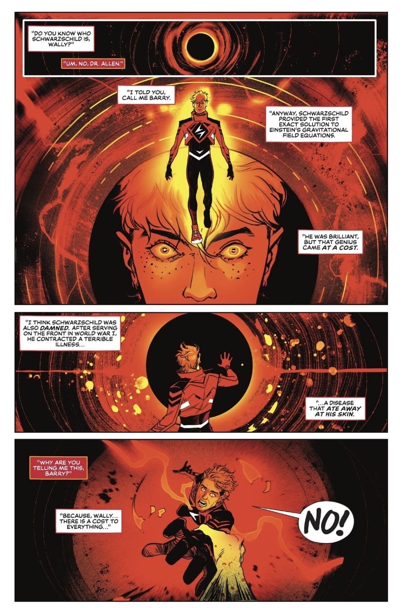 While the heist is the main plot, there is a darker undercurrent running through the issue. The book opens with a flashback to Barry Allen talking about Schwarzschild and the “cost of genius.” It’s a heavy, scientific conversation that sets a sense of dread. Barry warns that “there is a cost to everything,” and we see that cost playing out in real-time with Wally.