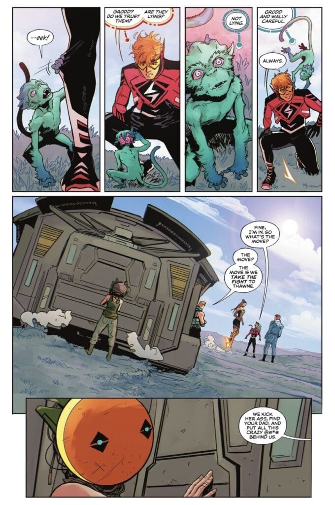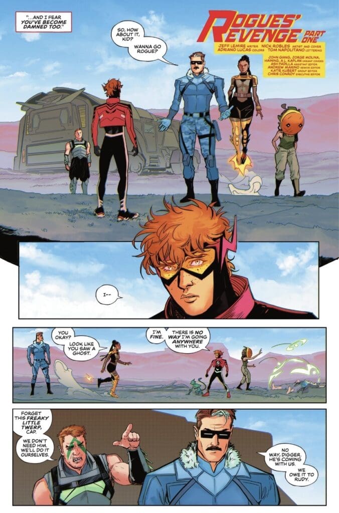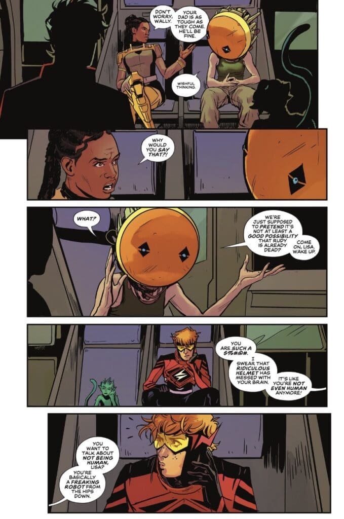 The dialogue in this issue is where Lemire really shines. It’s snappy and reveals so much about the relationships without needing big exposition dumps. There is a moment on the ship where the friction boils over. Trickler, who is in Thawne’s pocket, lashes out at Lisa (Golden Glider). She insults her appearance, calling her a “robot from the hips down” because of her tech.