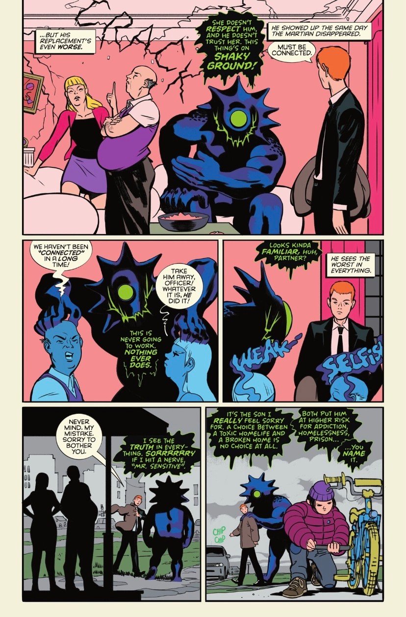 Meanwhile, the Martian is subjected to a cruel vivisection by his government captors. It’s a frightening series of panels. The agents rip into him with glee, tearing open his torso and pulling out his insides. We see the classic board game Operation on page ten in a fantastic panel by Rodriguez, only the Martian is now occupying the operating table. The next panel shows the agents opening the alien’s stomach as a kaleidoscope of yellows, greens, and pinks erupts from the center. It’s sensory overload in the best way and almost makes you forget the horrors being committed.