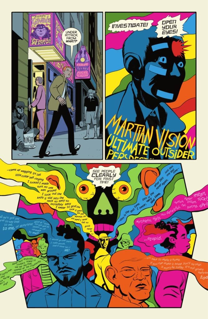 The visual storytelling here is consistently inventive, especially when demonstrating the Martian’s abilities. We see this ‘Martian Vision’ through stunning, trippy colors that externalize the alien’s perspective. But this ability is more than just telepathy with a fresh coat of paint. It is also a vital narrative tool that grounds the story in humanity. For example, seeing John witness the final thoughts of mass shooting victims is personal, poignant, and profoundly moving. It’s one of the many touches that make this series so special.