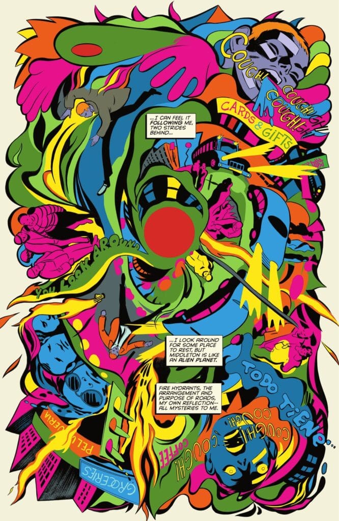 If Deniz Camp provides the psychedelic script, Javier Rodríguez delivers the visual high. He is unequivocally the perfect artist for this project. His style (clean and vibrant) is amplified here with a constant, frenetic undercurrent of psychedelic color. The result is a book that explodes with an “angry cartoon” palette of reds, greens, blues, pinks, oranges, and yellows. It’s the most artificially colored book in the best possible way, creating a visual feast that makes the reader feel as disoriented and hyper-aware as John Jones himself.