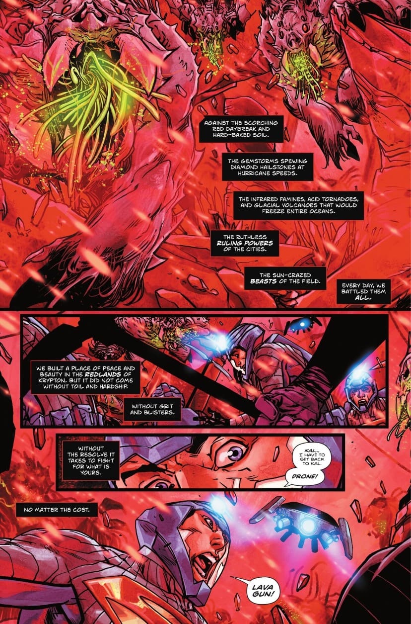 The story opens on Krypton in the past, with Jor-El trying to save people from a cave-in. What starts as a rescue mission quickly turns into a terrifying fight for survival against monstrous Magmoles. The art here is breathtaking. Di Giandomenico and colorist Arreola perfectly capture the otherworldly beauty of the Redlands, making the striking red crystals of the caves feel both gorgeous and dangerous. The Magmoles themselves are drawn as effectively terrifying creatures, with gigantic claws, appendages, and multiple deadly tongues that sell you on the danger of Krypton before it even blew up.