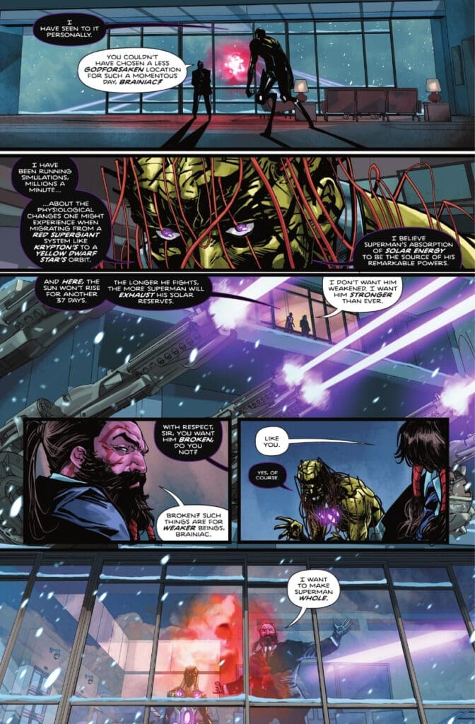 Back in the present, Ra’s al Ghul and Brainiac are waiting for Superman at their Lazarus Corps Greenland base. The interaction between them is a highlight of the book. You can tell they’re not on the same page, and their eventual split is going to be messy and epic. But first, there’s a small matter of Superman showing up in a fiery descent from the sky, absolutely wrecking fighter jets.