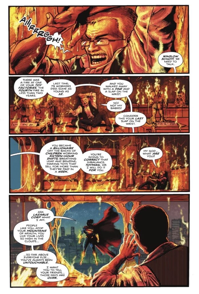 We also get a glimpse into the differences between this Superman and the main one from Earth-0. Absolute Superman isn’t above intimidation, as evidenced in the panels where he confronts a corrupt toy executive. In this scene, Superman is portrayed as downright scary. Ferreyra renders him as a dark silhouette, with his blood-red cape sprawled out like a demon’s wing. The fiery environment is bathed in bright, all-consuming oranges that creep ever closer to the executive. The cherry on top is when Ferreyra uses sinister reds to color Superman’s eyes. This isn’t the hero who comforts dying children, this is a man who terrifies the corrupt.
