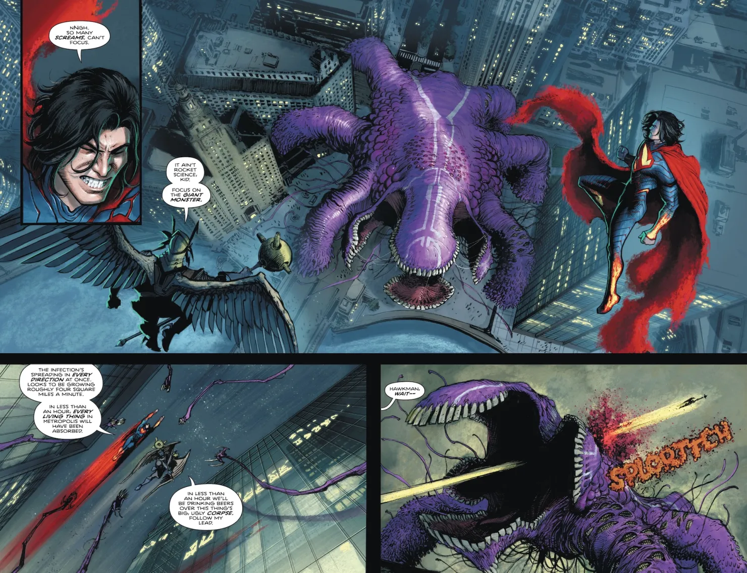 Hawkman has never been more fascinating than he is now. He’s not a bad guy, he’s just been beaten down by a system that rewards cruelty. This comes to life on a brilliant page thirteen, as Superman confronts him while they’re both being probed by Parasite. Ferreyra uses an outline of Hawkman’s helmet to contain the proceedings, with Parasite’s sinewy flesh acting as the panel borders. The villain’s outward calm is revealed to be a front, as his inner self is panicking about the state of the world and the wrongs he’s committed. It’s a refreshingly nuanced take on the B-lister.