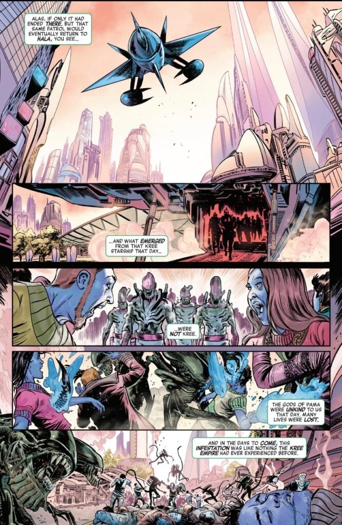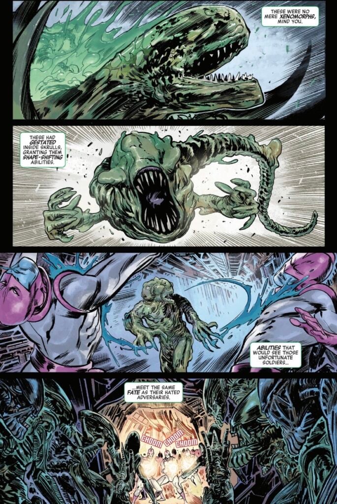 The story kicks off with a flashback from Mar-Vell, detailing why the Kree joined the fight against the Xenomorphs. They discover a Skrull warship drifting suspiciously through space and decide to investigate. It’s a fatal mistake. Xenomorphs have already massacred the Skrull battalion, but with a twist. The Xenomorphs born from the Skrull inherited their shape-shifting abilities, creating an appalling new enemy.