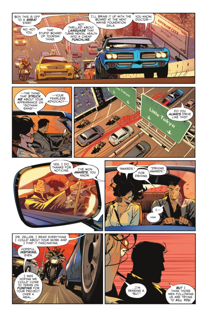 Fraction’s dialogue is snappy and carries a dry, self-aware wit. Bruce’s billionaire persona is on full display as he brags about winning driving awards while weaving through traffic in a classic blue GTO. However, the evening takes a sharp turn toward the Batman side of things when Bruce notices they are being shadowed by a group of motorcycle-riding assassins with swords.