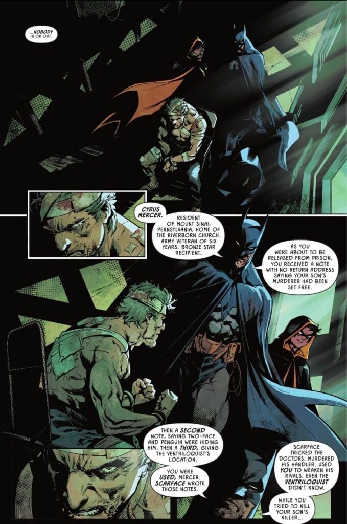 In the wake of the Quiet Man’s capture and the re-emergence of Scarface, Batman and Robin try to piece together the missing pieces of a looming gang war and how it connects to one man’s quest for revenge. The duo breaks into Blackgate Penitentiary, revealing to him that he’s merely been a pawn in Scarface’s game, a dog let loose to distract his enemies. Though Bruce criticizes his lethal mission, the Quiet Man throws it back in his face, asking, “What do you know about what losing family does to a man?” It’s this question that fuels this entire arc. As Scarface sets up for his big show of power against the Penguin, Robin defends the Quiet Man against Bruce’s judgment in the pouring rain, pointing out how this new villain is not all that different from the two of them.