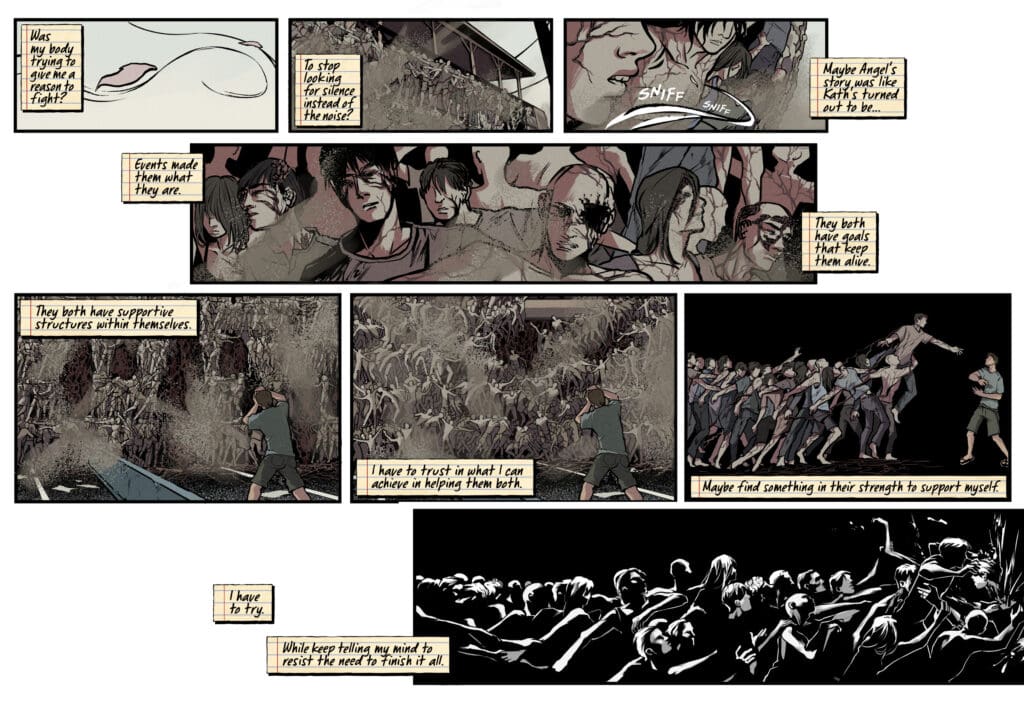 I’m a little hesitant when I see other writers handle mental health topics in a way that feels too much like a self-help book. To avoid that, I’ve studied how self-help books are structured. The two comics I believe have really nailed the portrayal of mental problems and how the brain works without being preachy are a series, Asterios Polyp, by Mazzucchelli—who worked with Frank Miller—and Clyde Vents by Seth. These comics analyze how the brain works and how mental problems affect people without giving you an easy answer like, “Hey, everything’s going to be okay”. They also explore how different environments and cultures can affect a person’s development. That’s the core of the story, with the zombie apocalypse as a sub-level or a background force of nature.