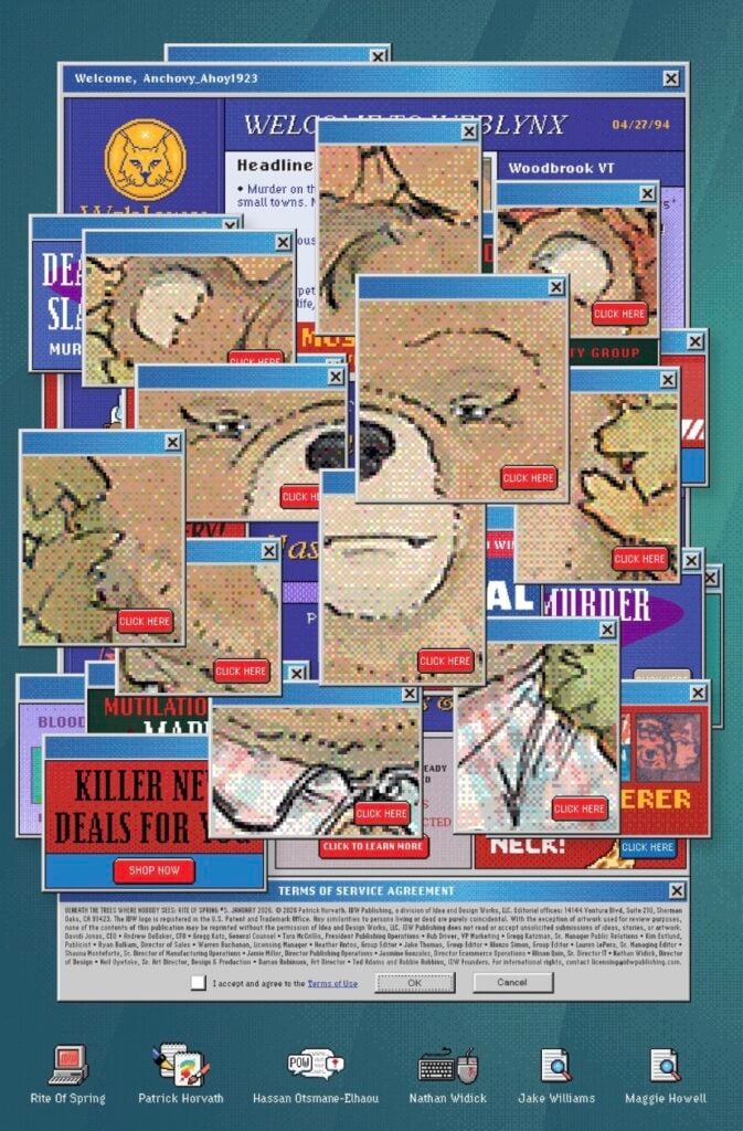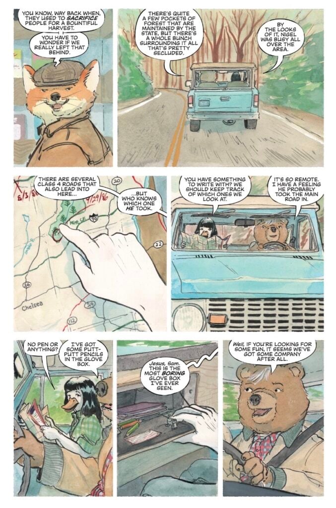 Horvath’s artwork continues to be fantastic. The village of Woodbrook is classic small-town American, lined with Mom and Pop stores where locals have casual conversations and go about their day. The animal citizens are intentionally adorable, covered in soft watercolors and pastel hues that evoke childhood innocence, and directly contrast with the violent themes of this series.