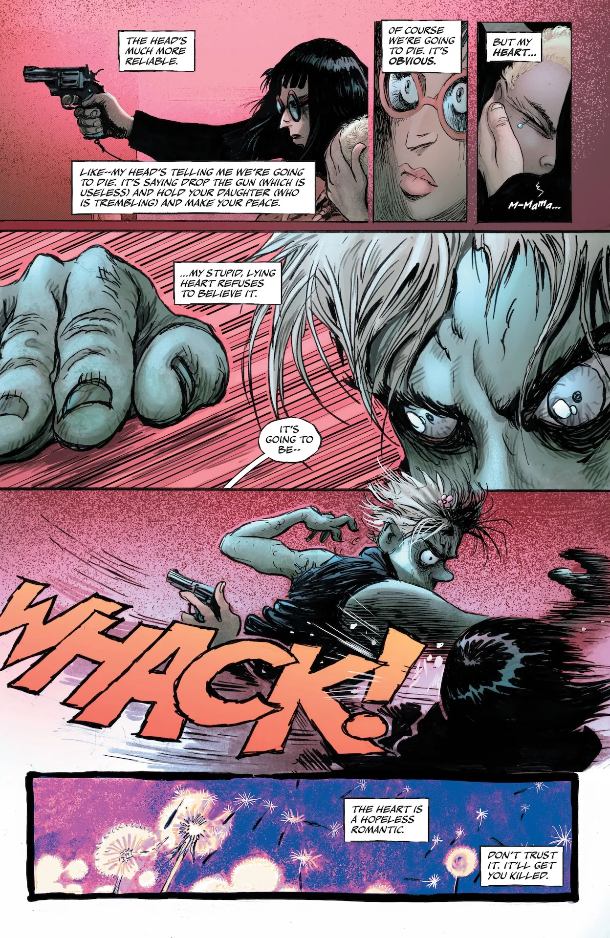 Camp’s writing shines as he highlights the mother’s voice. She’s still fighting, but she’s no fool. The life she and her daughter are living is bleak. It’s heartbreaking to read her assert that their life is no better than death given the circumstances. She gives birth in the back of the car with no medical help and watches her lover be consumed by a horde of zombies, all while fighting tooth and nail to keep her daughter safe. Letterer Hassan Otsmane-Elhaou makes you hear the action, as dynamic SLAM, RIIIP, or WHACK sound effects dance across the panels. It’s enough to make you wonder if survival is really worth it.
