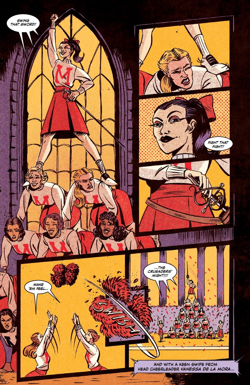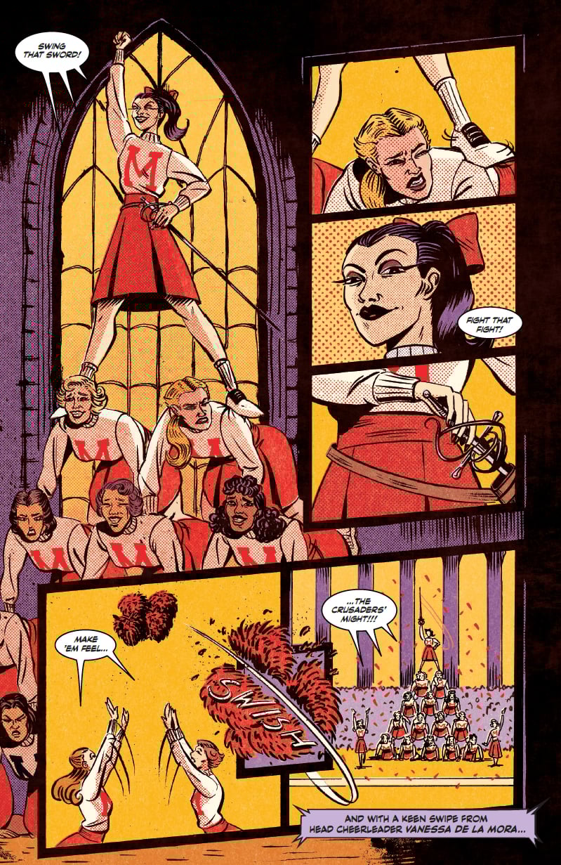 What makes the plot so engaging is the frantic, overlapping assassination attempts from these “love” birds. While the school prepares for the Homecoming Melee, which BTW is a literal sword-fighting duel between Manderlay Prep and their rivals, the Swashbucklers, Vanessa and Edgar are busy recruiting fellow schoolmates to do their dirty work for them. From here on out, things only get worse for everyone involved.