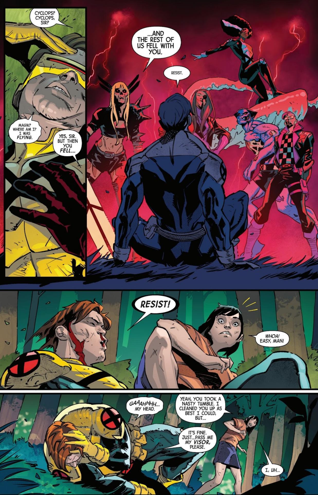 As Cyclops #2 shows, the Reavers are not the only ones to have spotted Cyclops’ beams. He is pulled from the wreckage of his accident by Mei, a mutant who has been enslaved by the Reavers to dig in a mine alongside many others. Mei is spunky and tough in conversation, not easily awed or impressed by Cyclops or his sense of cool, analytical detachment. Cyclops, for his part, must confront an issue he faced in the first issue: a mutant who doesn’t follow orders well. And unlike Magik and Quinten Quire, Mei is no X-Man, not trained, and not deferential to his authority. The character adds an intriguing complication to Cyclops’ survival efforts, providing equal parts helping hand and pressure.