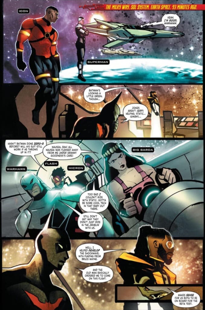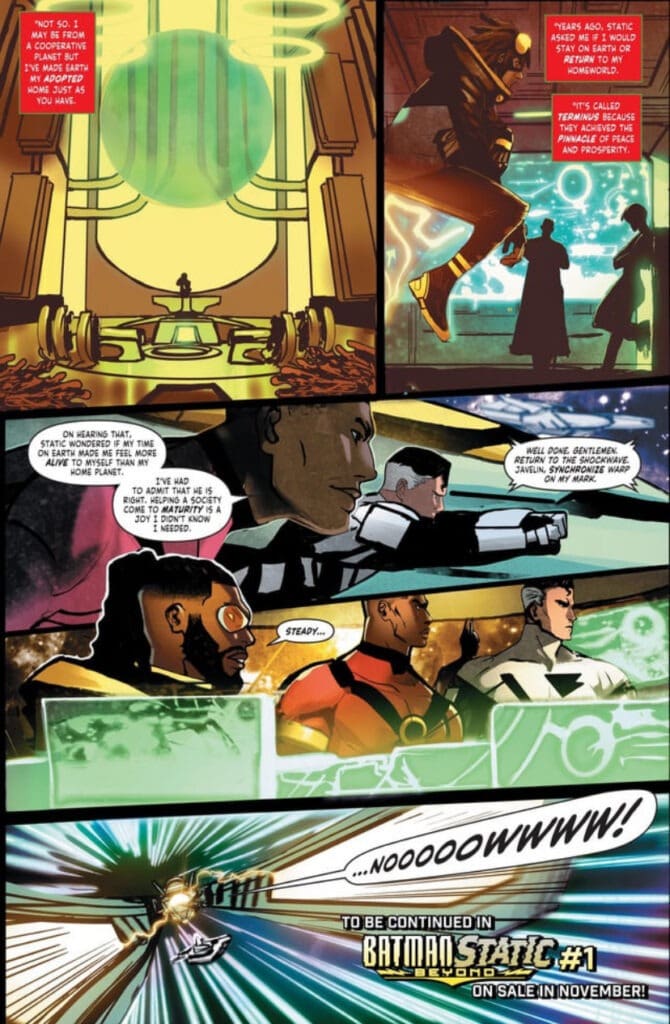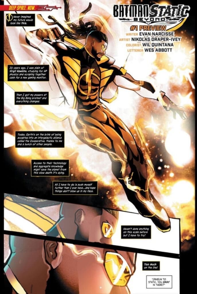Written by Evan Narcisse and with art by Nikolas Draper-Ivey, the series brings together Terry McGinnis (Batman Beyond) and Virgil Hawkins (Static). The story begins in November 2025, as the two heroes confront a global crisis. While Terry patrols the futuristic streets of Neo-Gotham, Virgil is busy launching a new clean energy grid in Dakota City. Everything seems to be going smoothly as Earth prepares to join a galactic alliance, but a mysterious villain suddenly causes a worldwide blackout. With technology completely crippled and society on the brink of chaos, Batman and Static must team up to save the world, relying on their wits rather than their gadgets.