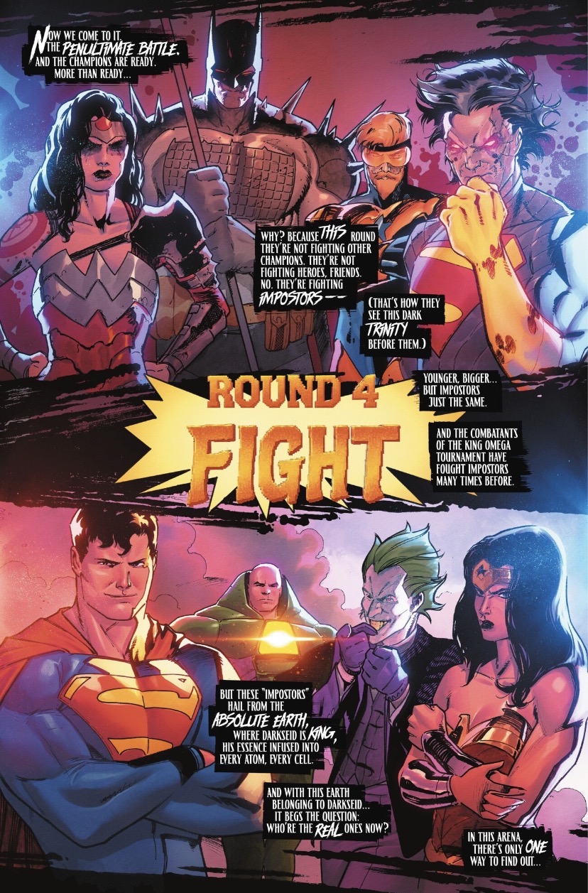 Right from the jump, DC K.O. #4 is absolute chaos, and I love that Scott Snyder and Joshua Williamson don’t waste a single second trying to explain who the Dark Trinity is or why they aren’t themselves. It honestly doesn’t matter in the heat of the moment; the issue’s energy is just “let’s fight,” and it works perfectly for a penultimate chapter. We are dropped into the King Omega Tournament, where the stakes are as high as the body count, and the “Trial by Absolute” feels like a frantic, red-hued descent into cosmic horror.