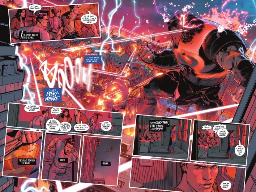 We get a surprising pivot into a pocket reality created by the Time Trapper (Doomsday). It’s a clever trump card that shifts the momentum. Colorist Alejandro Sanchez uses a permeating red shade that makes this version of Doomsday feel genuinely sinister. The interaction between Doomsday and Superman provides the emotional backbone of the issue. When Doomsday makes the ultimate sacrifice to jumpstart Kal-El with Alpha energy, the “Goodbye, Kal-El” moment hits hard. Letterer Hassan Otsmane-Elhaou uses a striking LIVE effect that adds a visceral punch to Superman’s resurrection.