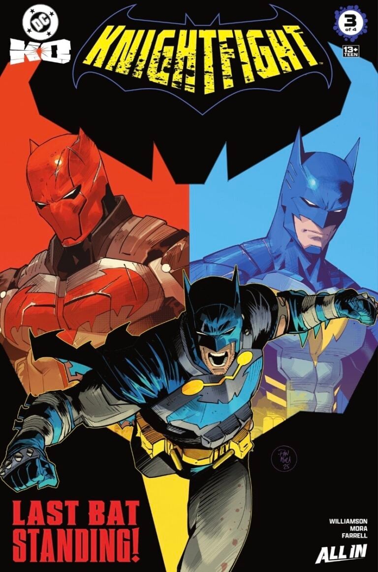 For a series titled “Knightfight,” the third issue of this event spin-off is more concerned with talking than throwing punches, and it’s all the better for it. In Joshua Williamson and Dan Mora’s DC K.O.: Knightfight #3, the pair crafts a touching story that does justice to the Robins while depicting Bruce’s love and admiration for the people they’ve become.