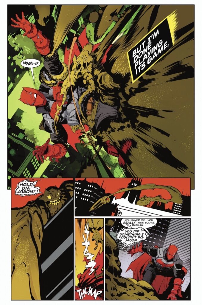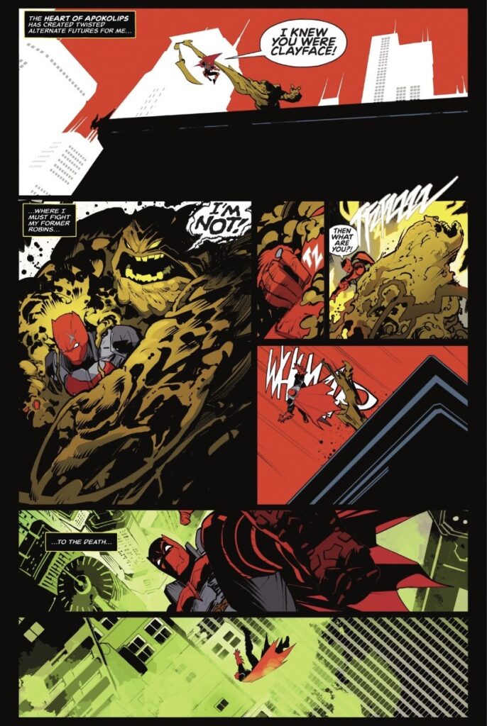 The colors from Tríona Farrell deserve equal praise, especially in the case of making each Gotham feel unique, the almost monochrome red-heavy Gotham of Jason’s universe being a particular highlight. The lettering by Tom Napolitano is also well worth a shout-out, particularly in the early clayface-heavy pages.