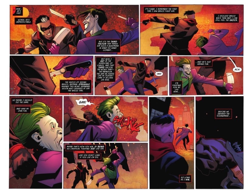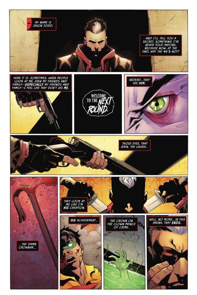 Jason gets the narrator role here and the insights into his character are the highlight. He’s always been defined by others’ actions, including Batman’s tutelage or his death at Joker’s hands, and he struggles with this conflict each round.