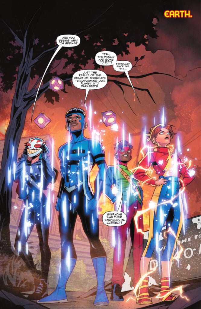 Andrew Dalhouse’s colors bring a vibrant, modern pop to the issue. There’s the blue-hued Lunar Watchtower, and then you’ve got the hellish, red-sky terraforming happening on Earth, which creates a palpable sense of stakes. The energy effects, from the crackle of Speed Force lightning to the glow of Fairplay’s motherbox cubes makes the action glow in the right places. Finally, letterer Dave Sharpe’s placement helps guide the eye through the kids’ rapid-fire banter and the sound effects.