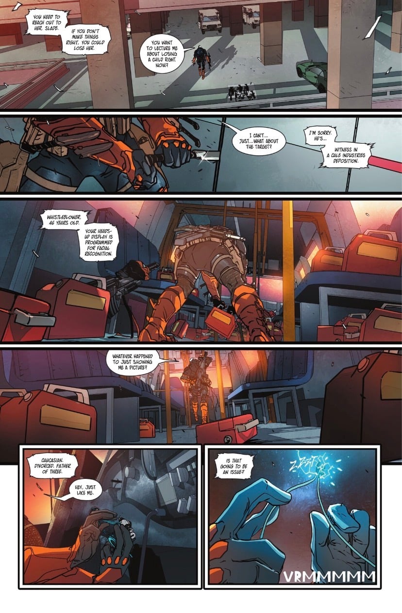 The issue moves fast. Slade is back on the job, surrounded by an arsenal that would make a small country jealous. His first target is a whistleblower from Cale Industries. If that name sounds familiar, it’s because Veronica Cale is a classic Wonder Woman villain. Fleecs nails Slade’s voice early on with a dry joke about the target being a divorced father of three. It’s the kind of dark humor you’d expect from a guy who kills for a living.