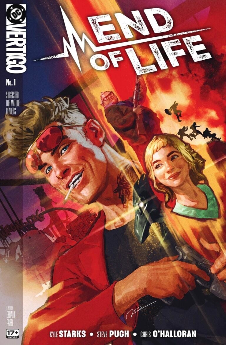 Twenty-four days. That’s how long until the next issue of End of Life #1 comes out, and it couldn’t feel longer. Writer Kyle Starks bursts out of the gate with a debut issue full of stylized violence, crude humor, and an instantly memorable lead. If you’ve been craving a break from superheroes, then this action-comedy is the comic for you.