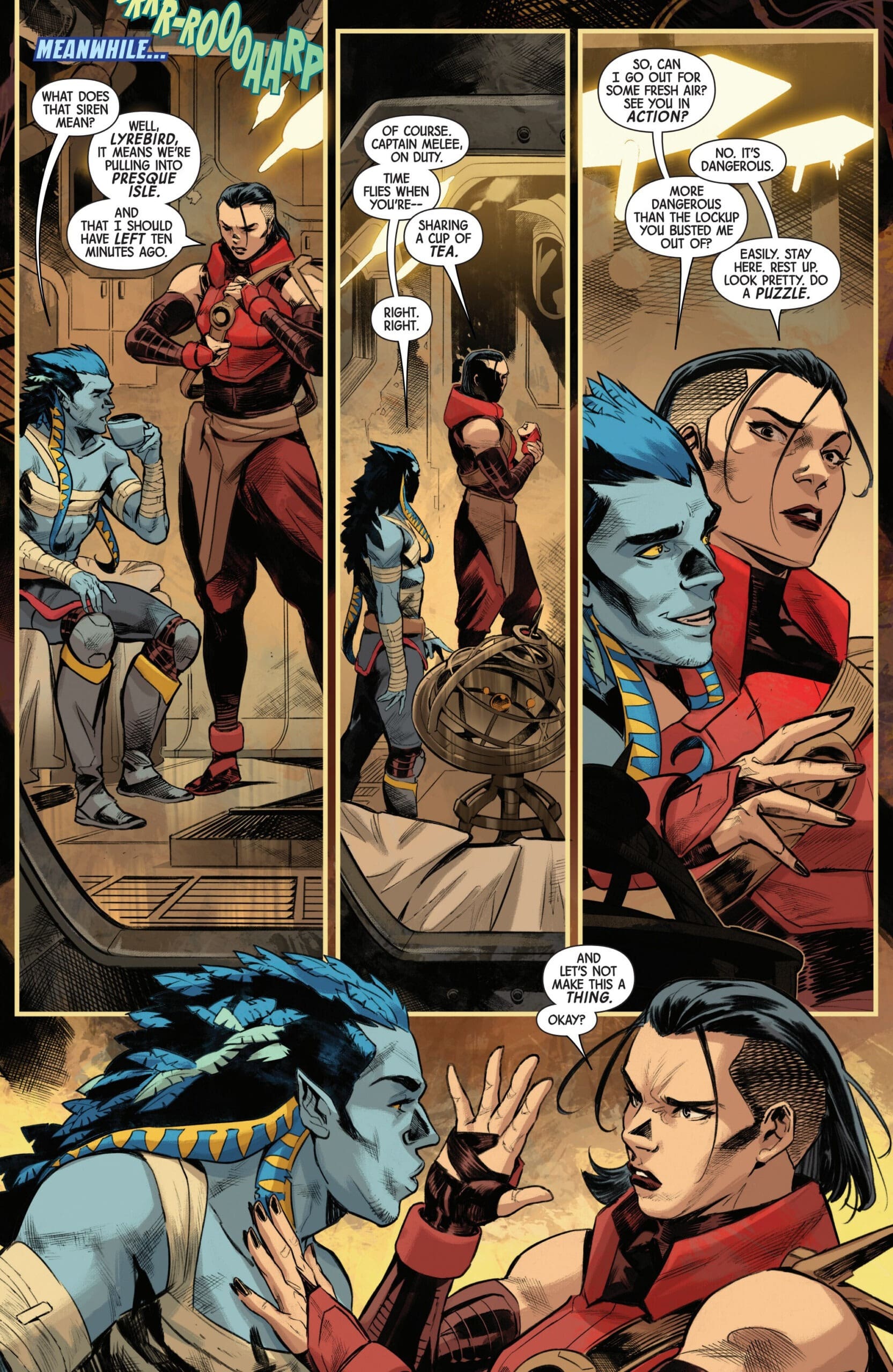 Kamala Khan, Bronze, Melee, and Rift are our central team for this book, operating as the mercenary team known as the Blue Dashers. When they’re charged with securing a mutant by the name of Lyrebird by Mystique, the group breaks him out of a prison and takes him aboard their flotilla. We see there that Colossus is among their group, unwell and being tended to by Bronze. It’s there where we pick up, with Bronze bringing breakfast to the ailing mutant. Colossus is not a character we have seen much of in the From the Ashes era, so some focus here on his character is quite welcome.