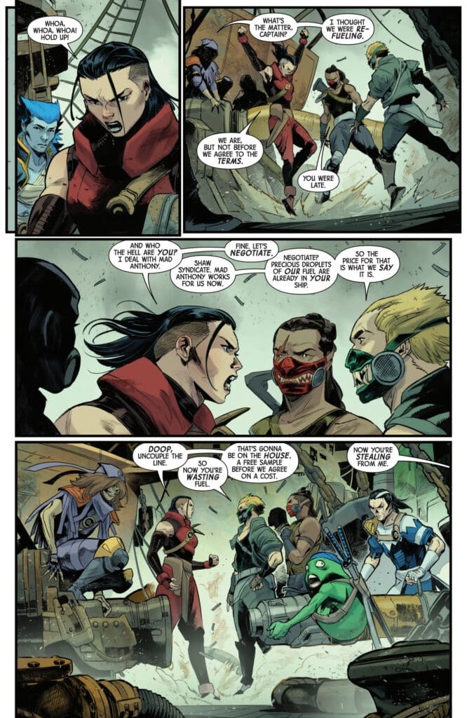 Meanwhile, Lyrebird, the rescued mutant, becomes suspicious of his rescuers, as they become suspicious of him. During what could only be described as a pirate attack by Shinobi Shaw, Lyrebird reveals his secondary mutation: the ability to combust what he touches and manipulate flame. Tensions quickly arise between him and the Blue Dashersm, with Lyrebird suspicious of where they are taking him, and Kamala Khan suspicious of who Lyrebird really is. Things go awry when the team begins to bicker on what to do with Lyrebird, with Thao wanting him gone, while Bronze, Rift, and Colossus vote to take him to the Limbo Lands and complete their mission. Thao releases him anyway, and that’s when Kamala takes matters into her own hands. While recapturing Lyrebird, Kamala finds out that the flotilla is built on a surprising secret. But her revelation comes too late, as the team finds themselves in the Limbo Lands.