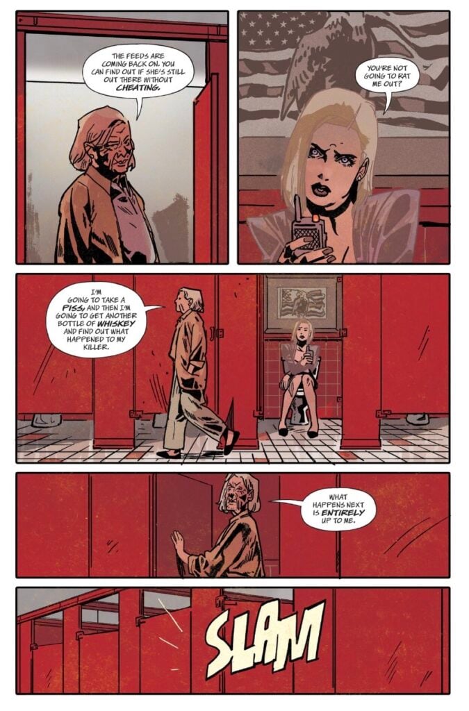 Jordie Bellaire is doing some of the best color work in the industry. It feels like a scene change in a movie each time the character’s perspective shifts. The wild oranges of the flaming cornfield complement the dystopian red of the thirteen’s viewing room, while the graveyard confrontation between Laura and the Lone Gunman is appropriately shaded with creepy blues and greys. Becca Carey remains a strength on letters, utilizing dynamic font size based on the character and what they’re doing. It greatly enhances the scenes between Laura and the dying Lone Gunman, the former’s dialogue full of exclamations and bolded words, while the latter’s speech bubbles are smaller and wobbly.