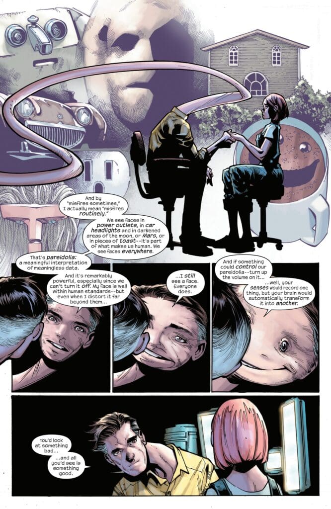 Taking her chilling hypothesis to her brother-in-law, Reed Richards, Alicia explores how a terrifying creature could make people perceive it as friendly. This is where writer Ryan North really shines. Reed deduces that the creature is hijacking pareidolia, that quirky cognitive phenomenon that makes our brains find meaning (like a face in a cloud) in meaningless data. In this case, the mechanism is making them see something awful and automatically transform it into something wonderful, like a harmless dog.