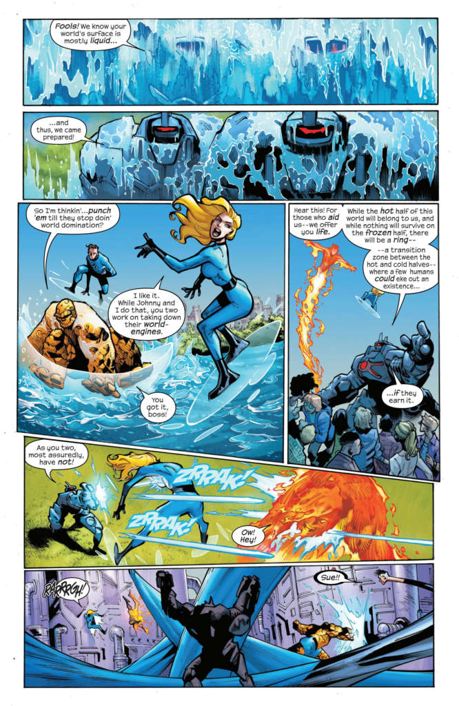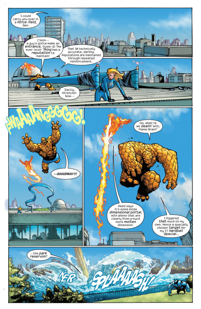 As mentioned before, North is always finding new ways for the team to use their powers, and Humberto Ramos is the perfect artist to bring his vision to life. Whether it’s Sue using her powers to create invisible objects or Reed manipulating his fingers to spell out the alphabet on page twenty-one, each panel is rendered in his signature, cartoony style. It may not work on every book, but his art seems tailor-made for the Fantastic Four. Reed, in particular, gets a lot of the best panels as his elasticity seems to pop off the page every time he appears.