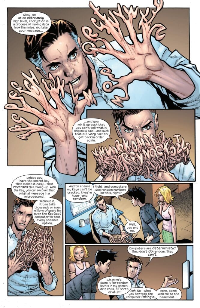 Back at the Baxter Building, the team is pondering Hill’s offer when they’re suddenly attacked by the Wingless Wizard. The C-lister has hacked into their security systems, immediately setting off alarms for Reed, who soon discovers that the random nature of the Cosmic Radiation he’s been using to generate his security algorithms has changed. Somehow that energy has stabilized into a singular, foreboding message from a familiar adversary. Three simple words sent by Galactus himself – “Find Susan Storm.”