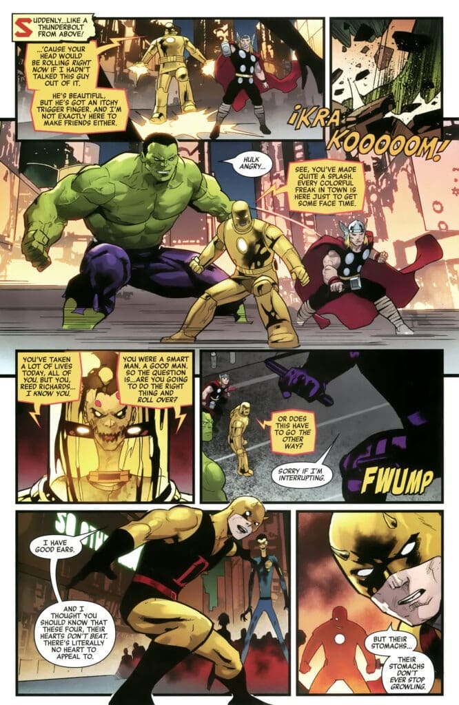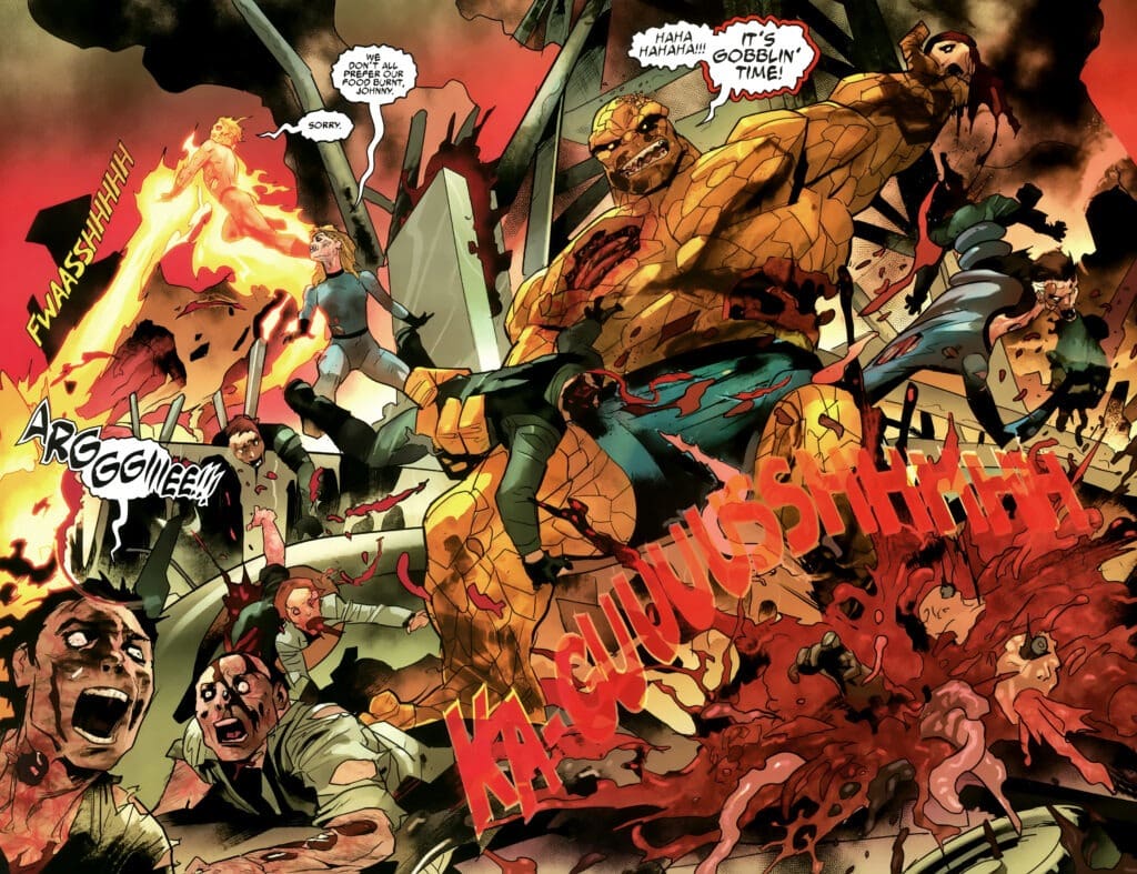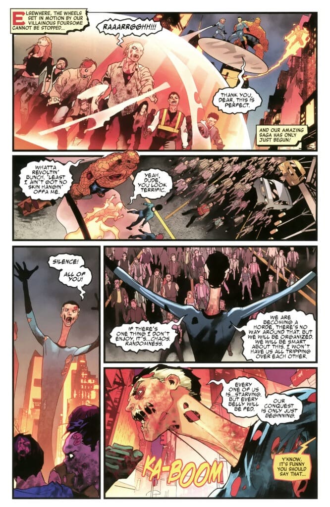 Even as heroes like Iron Man and Hulk arrive, they realize this isn’t a normal zombie outbreak. As Daredevil observes, these monsters have no hearts to appeal to, but their stomachs never stop growling. And this is the most chilling part: the Frightful Four are smart. Reed Richards hasn’t lost his organizational skills. He declares, “We are becoming a horde… But we will be organized. We will be smart about this.” Their goal is to recruit the powerful ones, and they’re not just looking for dinner; they’re planning a hostile takeover.