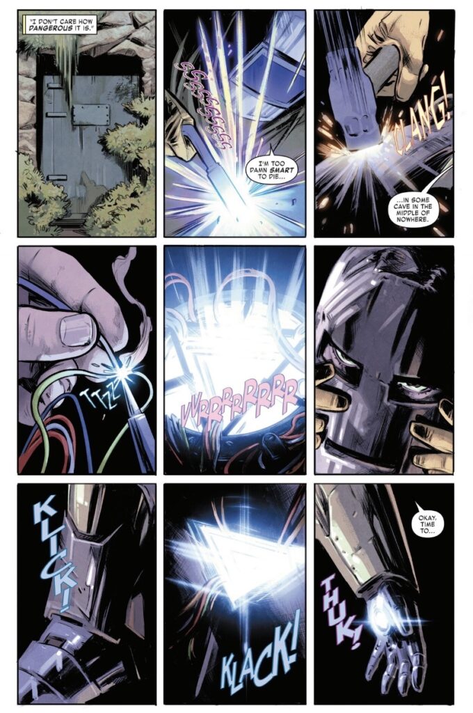 Nolan Woodard’s colors bring the whole thing to life. The Malibu scenes are drenched in warm, golden sunset hues, while the New Mexico workshop feels cooler and more clinical. The way the arc reactor and repulsors glow against the environment makes the tech feel vivid. Joe Caramagna’s lettering handles the “noise” well, too. Tony actually plays loud rock music to help him focus while he works, and the way the musical notes and sound effects are integrated into the panels makes you almost feel the vibration of the bunker.