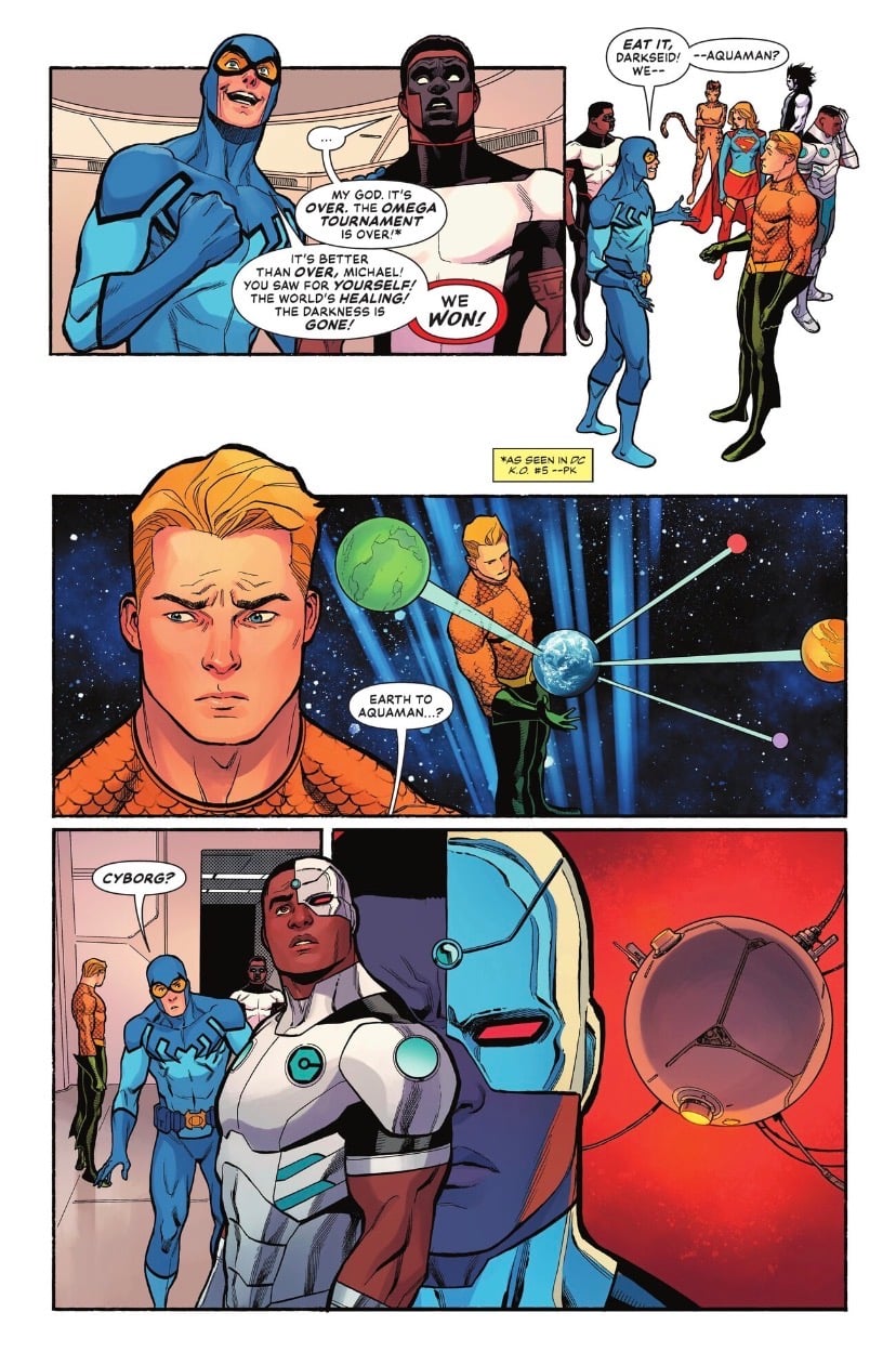 It’s a bit of a messy homecoming, however, with the heroes looking haunted by the whole K.O. experience. Captain Atom explains they’ve been infused with something called “Alpha energy.” It’s basically giving them psychic spoilers for the future of the DC Universe. Waid uses this to plant some serious seeds. We see a terrifying glimpse of what looks to be an evil Shazam, a panel of Hawkman’s wings burning away, among others. It’s an effective piece of world-building that makes the current “peace” feel incredibly fragile. Plus, with so many heroes present, seeing a Sideways cameo was a nice touch for those of us still rooting for the New Age of Heroes return.