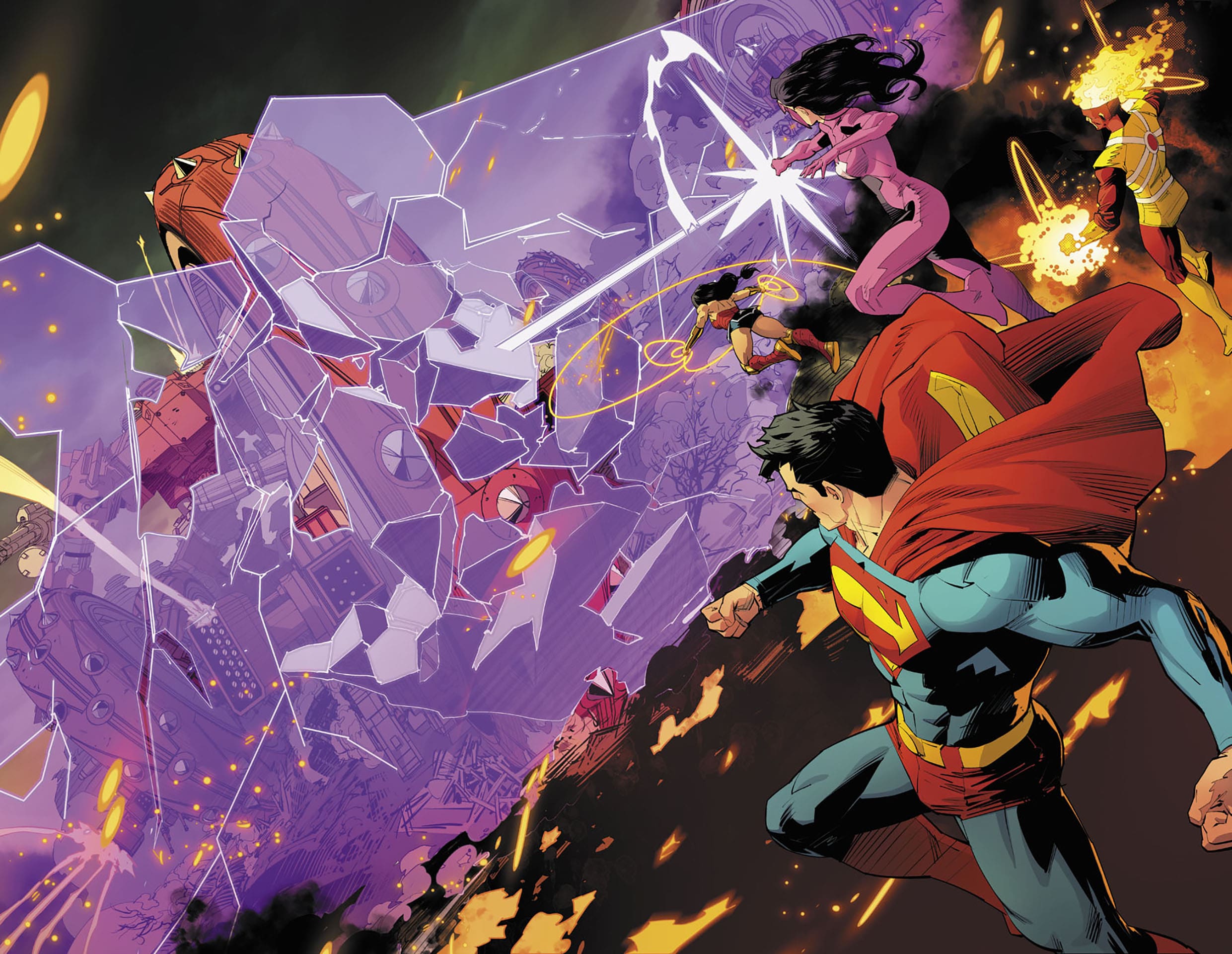 The action kicks off with a bang in the first issue, as the League faces off against a swarm of giant WWII superweapons, the War Wheels, in South Africa. The team, consisting of Superman, Wonder Woman, Black Lightning, Firestorm, Kid Flash, and newcomer Star Sapphire, has to protect innocent civilians from this unexpected threat. This chaotic but focused opening mission gives us a tour of the newly rebuilt Watchtower and introduces the series’ main antagonist: a new and terrifying supervillain team, Inferno. This enigmatic group quickly establishes itself as a formidable threat, a ruthless terrorist organization with the power to ignite the Amazon rainforest and declare war on the Justice League.