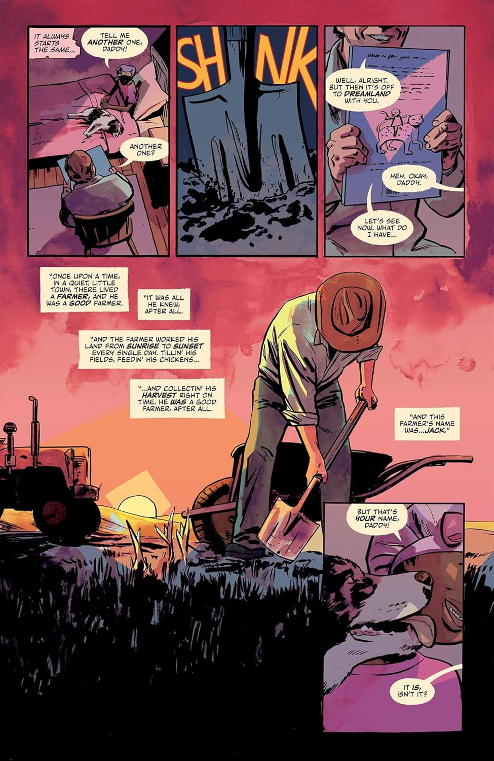 The plot centers on a man named Jack. He’s a farmer living on a hill just outside the town of Caverton. On the surface, things look great. He’s got a husband and a beautiful daughter. He spends his days looking after his land and the community. Brombal uses a macabre dualism to peel back the layers of this life; however, you quickly find out that Jack is actually living in a waking nightmare.