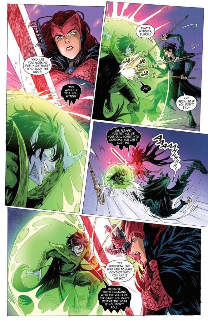 The story has great team-up potential as Nico eventually runs into Wanda Maximoff, the Scarlet Witch, who is Billy Kaplan’s mother. If you know Wanda, you know her magic operates on chaos, which is a total blast when she has to deal with Nightmare, Lord of Fear. They get pulled into a parallel dimension that was created when Nico, her girlfriend Karolina Dean, Billy Kaplan, and his husband Teddy Altman started playing a cursed role-playing game.
