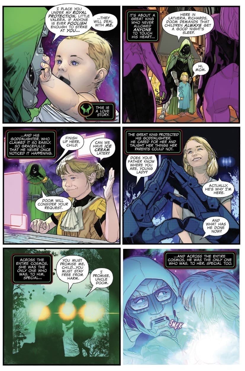 The absolute highlight of this issue is the touching (and slightly twisted) look at the relationship between Doom and Valeria Richards. For those new to the soap opera of the Marvel Universe, yes, Valeria is the daughter of Mr. Fantastic and the Invisible Woman, yet she is also Doctor Doom’s goddaughter. It’s confusing, but welcome to comics.