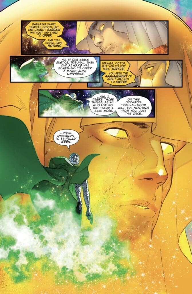 In a fascinating twist, the cosmic entity looks into Doom’s soul and sees that he actually loves something that isn’t himself. Because of this rare spark of humanity, the Tribunal grants his wish to restore Valeria, but, of course, at a great cost.