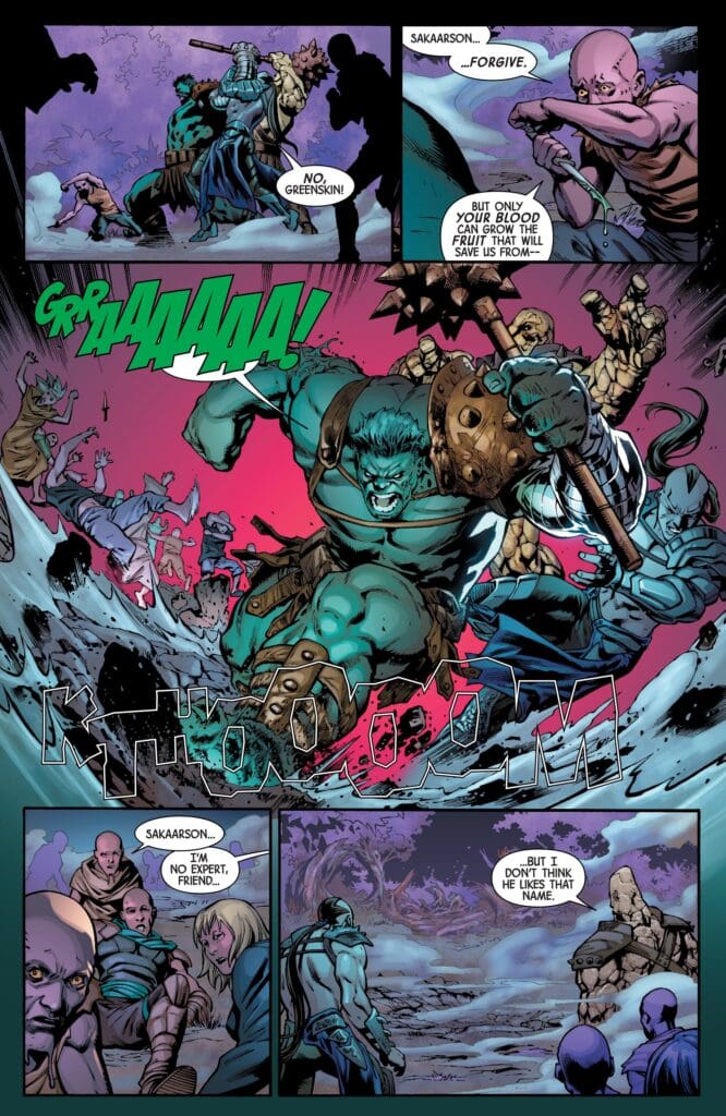 For readers unfamiliar with the setting, the comic quickly establishes the Hulk’s history on Sakaar: the “heroes” of Earth banished him there because they thought he was a monster. Once on Sakaar, the Hulk was enslaved and forced to fight as a gladiator, but he eventually smashed his way to freedom. Now, the people of Sakaar are faced with a new idea: the Hulk might be something better than a monster; he might be a hero!