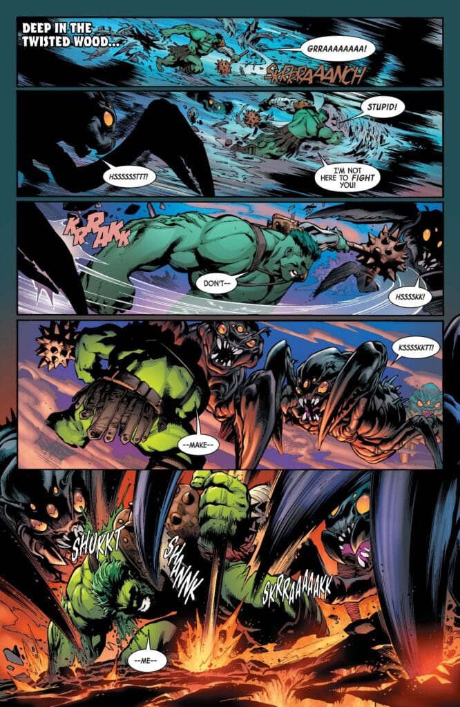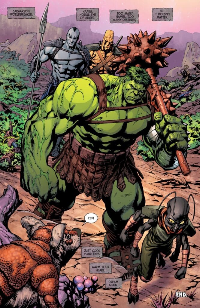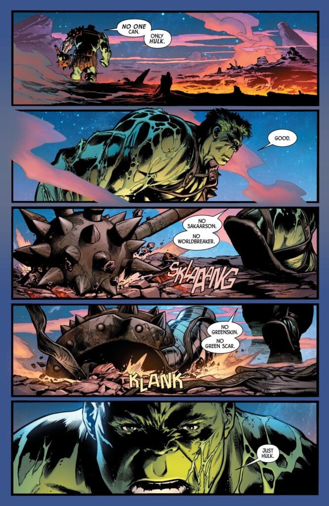 You get to see the core conflict of the Hulk’s identity play out immediately. As the people of Sakaar hail him with messianic names, Hulk is clearly uncomfortable, shouting, “I’m not… I’m not what they say”. But it’s not just a savior he’s running from. He is also The Worldbreaker, who prophesied to destroy. The weight of these titles (Savior and Destroyer) is central to the larger Planet Hulk story, and seeing his reaction to them here perfectly sets up the drama.