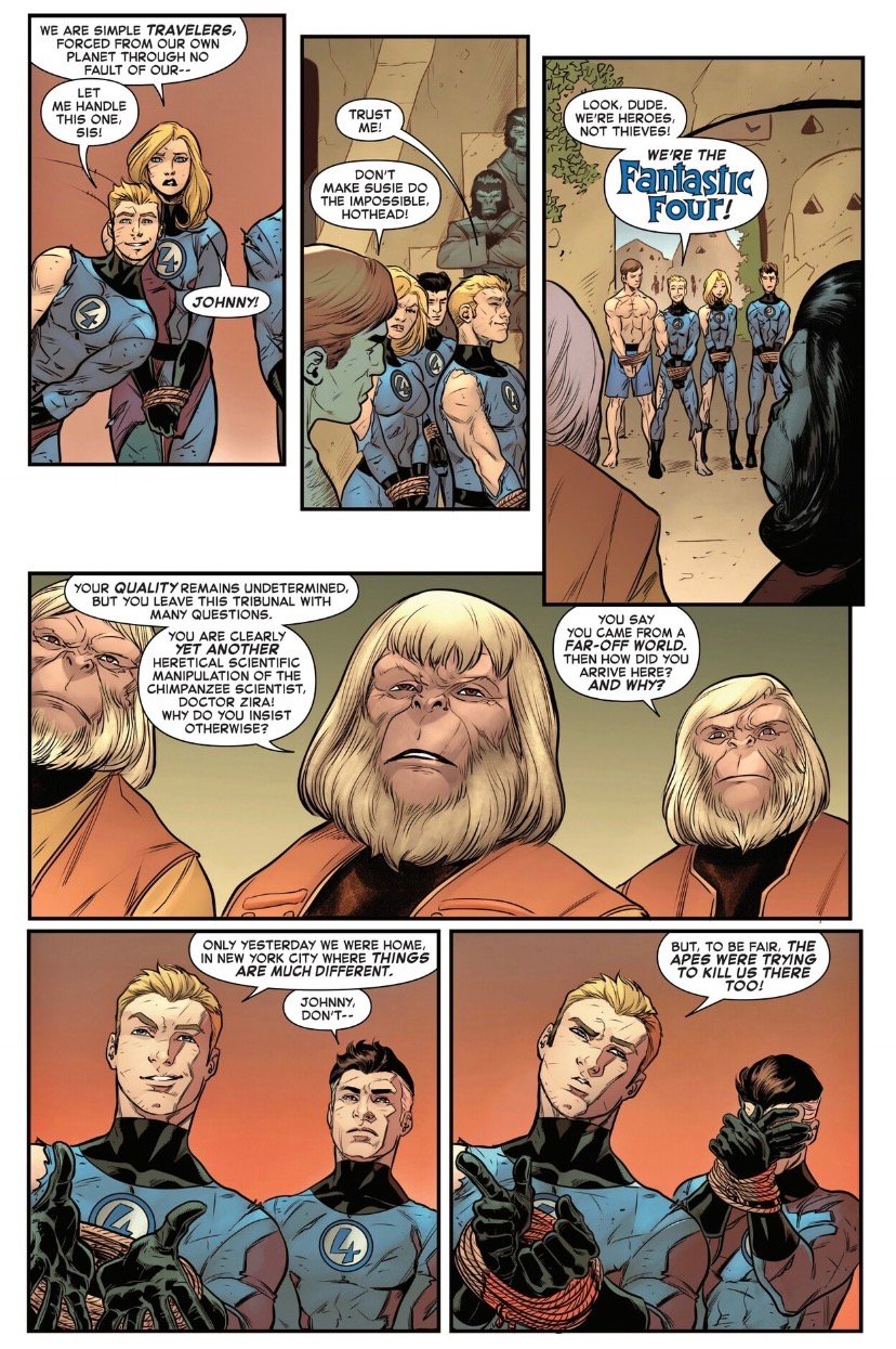 Trujillo nails Dr. Zaius, the dogmatic orangutan scientist, and his interrogation of the Fantastic Four is a blast. The cantankerous ape is quick to challenge our heroes, his text bubbles oscillating between calm fonts and bolded statements courtesy of letterer Joe Caramagna. Johnny Storm soon makes things worse in characteristic fashion while Reed Richards tries to appeal to their sense of logic. The crowd is hostile, with the gorilla General Ursus demanding punishment and chimpanzee scientists Zira and Cornelius being the only sympathetic attendees. Each character acts just as they would in the movie, proving they’re in expert hands as this series progresses.