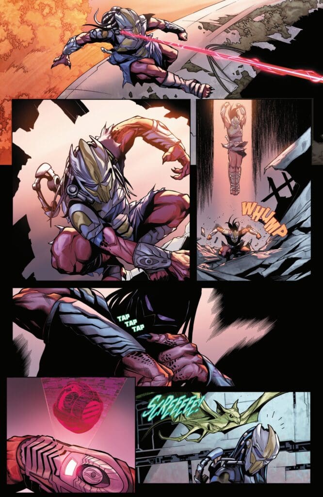 Elvin Ching and Oren Junior combine their talents to create a visually captivating issue that feels alive with motion and energy. Ching’s pencils capture Dek’s look and presence from the film with impressive accuracy, translating his movements and expressions into a style that feels both powerful and precise. Junior’s bold inking gives each page a sense of weight and depth, emphasizing the strength and agility of the combat sequences. The fluid choreography of Dek’s battles echoes scenes from the Badlands film, making the action instantly familiar yet thrillingly fresh on the page.
