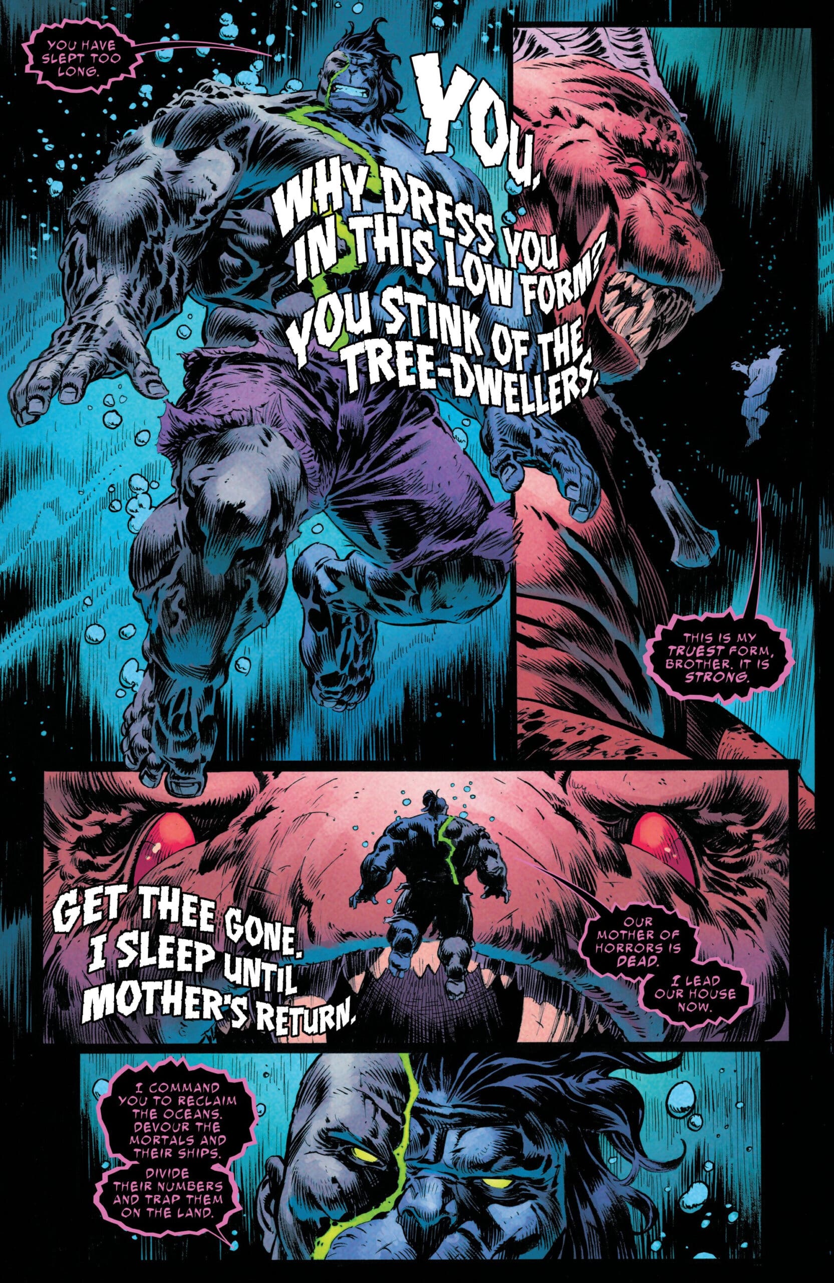 After establishing the living city of Golgothia in the Appalachian mountains, the Hulk sets his sights on Atlantis. Namor dismisses warnings from his fellow New Avengers, his characteristic arrogance once again rearing its ugly head. It’s not until Hulk summons Ngathil the God-Eater, one of Eldest’s eldritch siblings, that Namor realizes the danger he’s in. He watches helplessly as the Hulk defeats a creature that makes even the King of Atlantis look weak. By the time the battle ends, Namor has learned there’s a new hierarchy in the sea, and he’s no longer at the top.