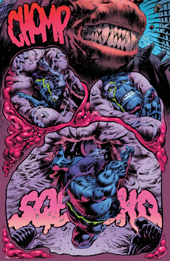 Matthew Wilson’s colors continue to elevate Klein’s artwork. The Hulk’s menacing purples and neon greens create a rich contrast against the deep blues of Atlantis, while Ngathil’s visceral reds enhance the revolting scenes inside his stomach. Letterer, Cory Petit, continues to make his mark with the sound effects. You can almost hear the action as each panel is brought to life by his dynamic fonts and word placement.