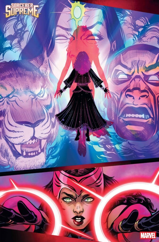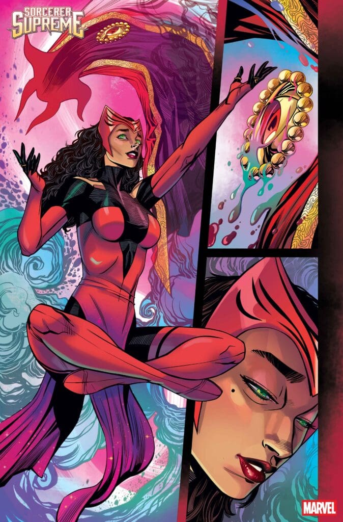 The preview for SORCERER SUPREME #1 shows Wanda rocking her new gear: the iconic Cloak of Levitation and the Eye of Agamotto. She’s not wasting any time, either, jumping straight into a battle with the terrifying Dormammu!