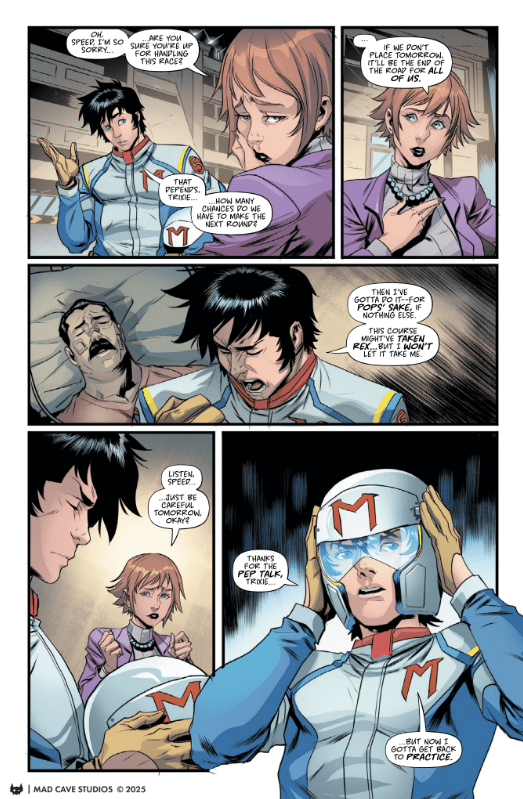 The creative team makes sure the action is a visceral experience. Davide Tinto’s art remains the kinetic engine of the series. The racing sequences are a visual feast, perfectly capturing the speed and chaotic nature of Formula X. Crucially, the intense close-ups on Speed really show his internal drama amidst the external high-speed action also happening. Rex Lokus’s colors deliver on the vibrant, saturated look we remember from the original anime. Finally, Buddy Beaudoin’s lettering adds energy with many bold, distinct driving sound effects. The scrape of a car or the snap of a broken part practically leap off the page, enhancing the adrenaline of the race and the plot’s dramatic turns.